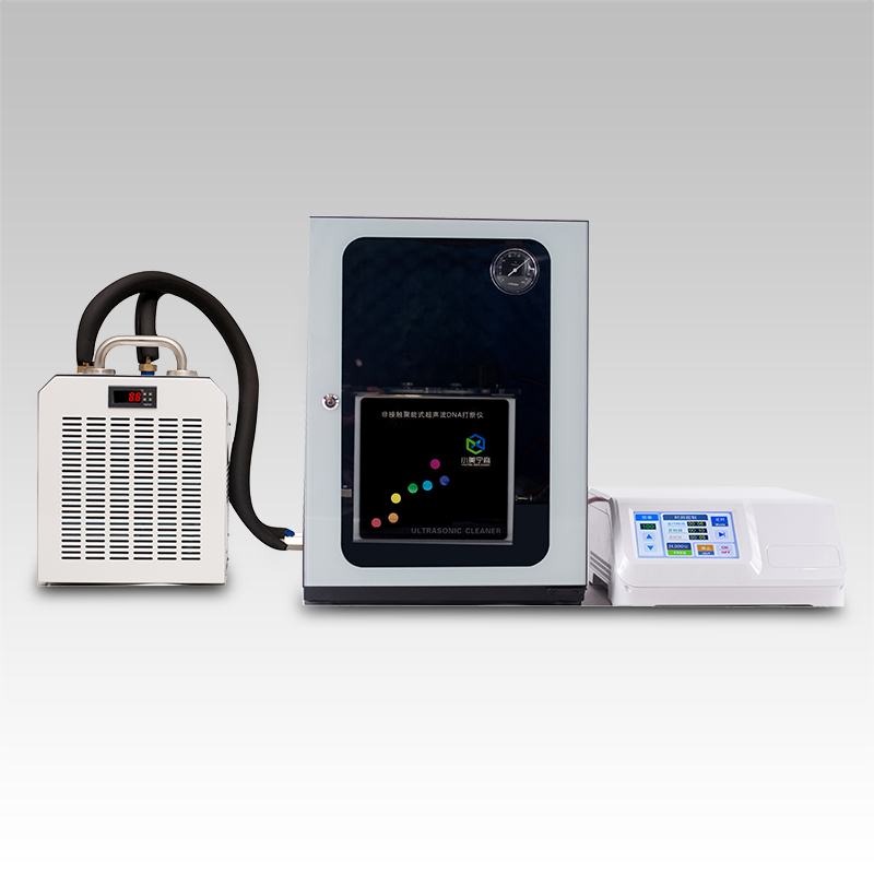 超声功率/时间调节及7寸液晶触控屏主机、超声水槽与抗噪音上盖、适配器旋转上盖、离心管紧固下盖、0.1~50ml 多种适配器及便携式冷却循环机。